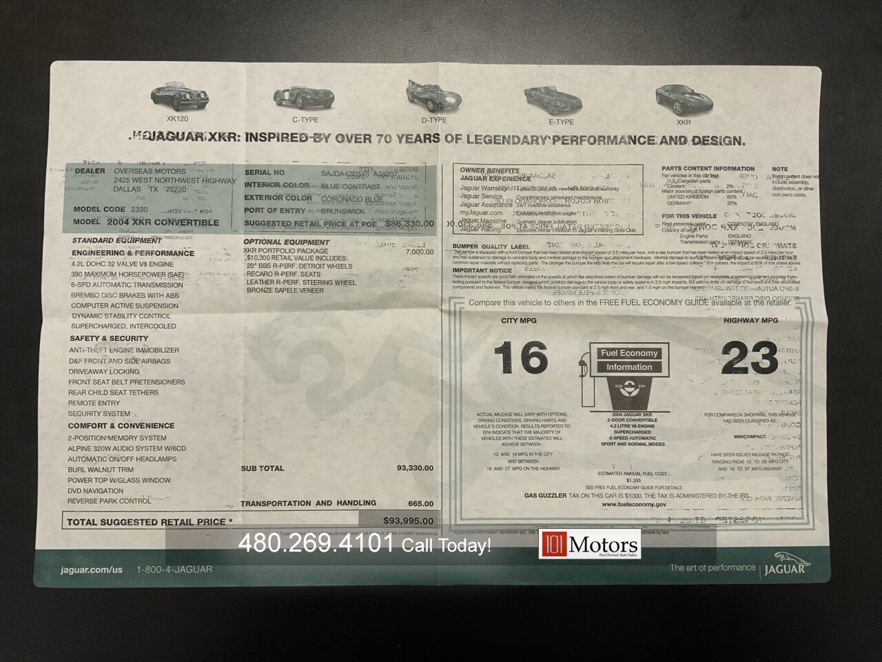 101 Motors is proud to present this stunning 2004 Jaguar XKR Portfolio. This RWD convertible is equipped with a 390 horsepower 4.2L supercharged V8 mated to a 6-speed automatic transmission. This Portfolio is 1 of 200 produced, and 1 of 100 finished in Coronado Blue! This XKR features Recaro sport seats, 20 inch BBS Detroit alloy wheels, bronze-stained Sapele wood trim, leather R-Performance steering wheel, Alpine audio, power soft top and more. You don’t want to miss this incredible opportunity, call today!!